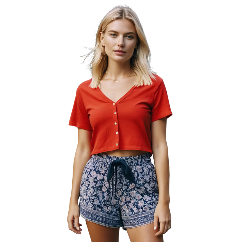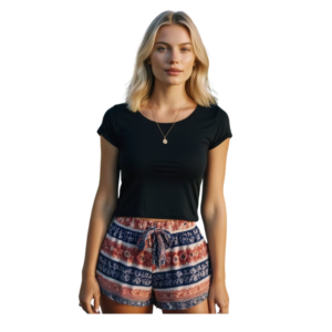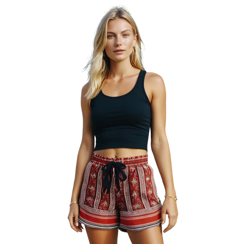 These women’s high-waist elastic waistband printed summer shorts are available in our organized size chart. Feel free to get in touch if you want to customize your shorts for bulk production based on your size chart and design.